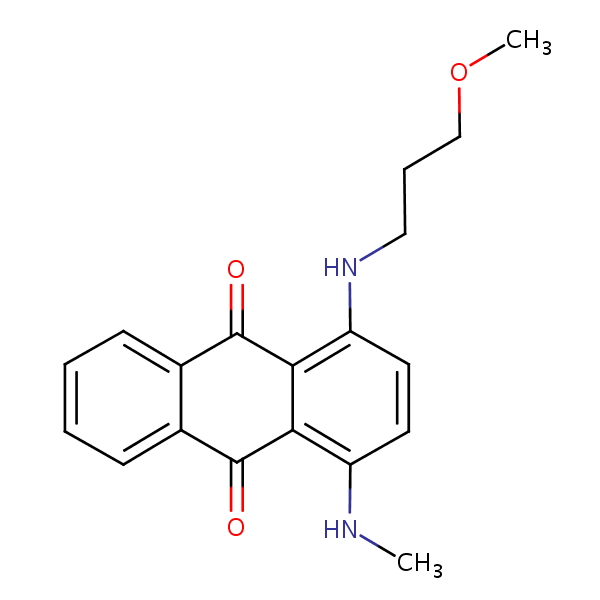 1-((3-Methoxypropyl)amino)-4-(methylamino)anthraquinone can be analyzed by this reverse phase (RP) HPLC method with simple conditions. The mobile phase contains an acetonitrile (MeCN), water, and phosphoric acid. For Mass-Spec (MS) compatible applications the phosphoric acid needs to be replaced with formic acid. Smaller 3 µm particles columns available for fast UPLC applications. This liquid chromatography method is scalable and can be used for isolation impurities in preparative separation. It also suitable for pharmacokinetics.