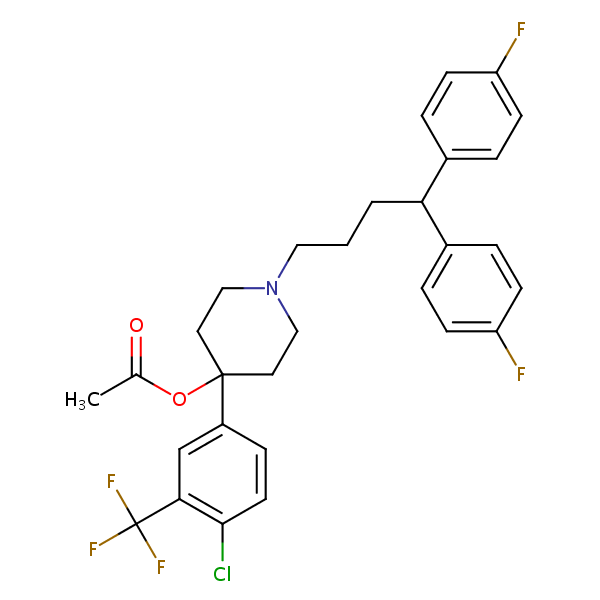 1-(4,4-Bis(4-fluorophenyl)butyl)-4-(4-chloro-3-(trifluoromethyl)phenyl)piperidin-4-yl acetate can be analyzed by this reverse phase (RP) HPLC method with simple conditions. The mobile phase contains an acetonitrile (MeCN), water, and phosphoric acid. For Mass-Spec (MS) compatible applications the phosphoric acid needs to be replaced with formic acid. Smaller 3 µm particles columns available for fast UPLC applications. This liquid chromatography method is scalable and can be used for isolation impurities in preparative separation. It also suitable for pharmacokinetics.