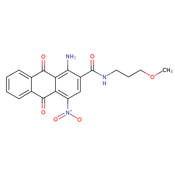 1-Amino-9,10-dihydro-N-(3-methoxypropyl)-4-nitro-9,10-dioxoanthracene-2-carboxamide can be analyzed by this reverse phase (RP) HPLC method with simple conditions. The mobile phase contains an acetonitrile (MeCN), water, and phosphoric acid. For Mass-Spec (MS) compatible applications the phosphoric acid needs to be replaced with formic acid. Smaller 3 µm particles columns available for fast UPLC applications. This liquid chromatography method is scalable and can be used for isolation impurities in preparative separation. It also suitable for pharmacokinetics.