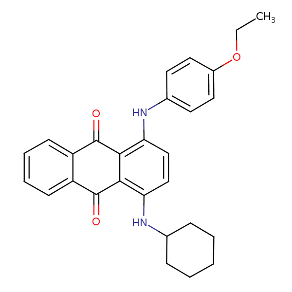 1-(Cyclohexylamino)-4-((4-ethoxyphenyl)amino)anthraquinone can be analyzed by this reverse phase (RP) HPLC method with simple conditions. The mobile phase contains an acetonitrile (MeCN), water, and phosphoric acid. For Mass-Spec (MS) compatible applications the phosphoric acid needs to be replaced with formic acid. Smaller 3 µm particles columns available for fast UPLC applications. This liquid chromatography method is scalable and can be used for isolation impurities in preparative separation. It also suitable for pharmacokinetics.