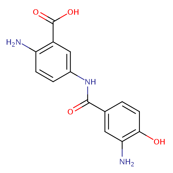 2-Amino-5-((3-amino-4-hydroxybenzoyl)amino)benzoic acid can be analyzed by this reverse phase (RP) HPLC method with simple conditions. The mobile phase contains an acetonitrile (MeCN), water, and phosphoric acid. For Mass-Spec (MS) compatible applications the phosphoric acid needs to be replaced with formic acid. Smaller 3 µm particles columns available for fast UPLC applications. This liquid chromatography method is scalable and can be used for isolation impurities in preparative separation. It also suitable for pharmacokinetics.