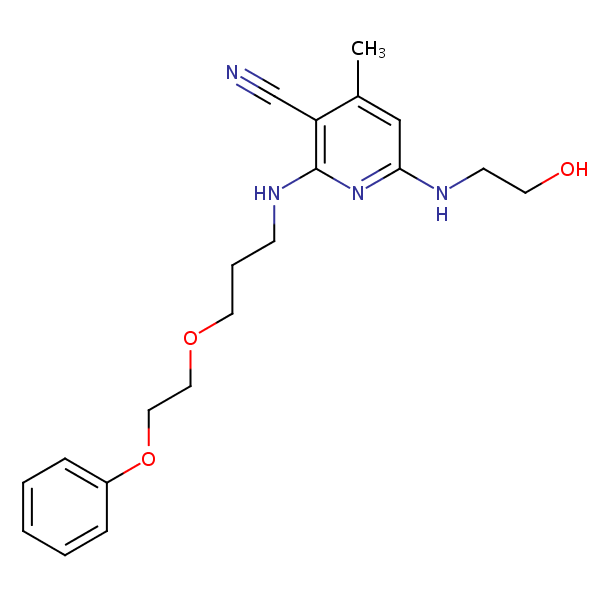 6-((2-Hydroxyethyl)amino)-4-methyl-2-((3-(2-phenoxyethoxy)propyl)amino)nicotinonitrile can be analyzed by this reverse phase (RP) HPLC method with simple conditions. The mobile phase contains an acetonitrile (MeCN), water, and phosphoric acid. For Mass-Spec (MS) compatible applications the phosphoric acid needs to be replaced with formic acid. Smaller 3 µm particles columns available for fast UPLC applications. This liquid chromatography method is scalable and can be used for isolation impurities in preparative separation. It also suitable for pharmacokinetics.