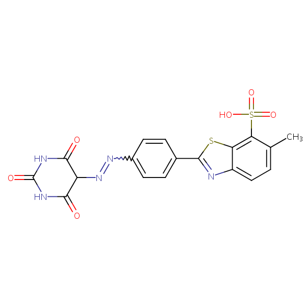 7-Benzothiazolesulfonic acid, 2-[4-[(hexahydro-2,4,6-trioxo-5-pyrimidinyl)azo]phenyl]-6-methyl- can be analyzed by this reverse phase (RP) HPLC method with simple conditions. The mobile phase contains an acetonitrile (MeCN), water, and phosphoric acid. For Mass-Spec (MS) compatible applications the phosphoric acid needs to be replaced with formic acid. Smaller 3 µm particles columns available for fast UPLC applications. This liquid chromatography method is scalable and can be used for isolation impurities in preparative separation. It also suitable for pharmacokinetics.
