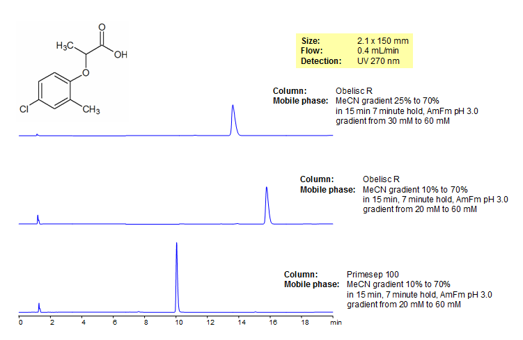 Mecoprop or methylchlorophenoxypropionic acid (MCPP) is a common herbicide found in many weed-killing/fertilizer products. The EURL (European Union Reference Laboratory) placed mecoprop in an Analysis of Acidic Pesticides using QueChERS method. Obelisc R and Primesep 100 were used to retain mecoprop, each with unique selectivity due to multiple modes of separation. Obelisc R contains embedded ion-pairing groups and a long hydrophobic chain, while Primesep 100 contains acidic ion-pairing groups. Method is LC/MS compatible and capable of retaining many different pesticides.