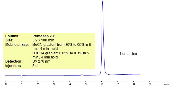 Loratadine is a second-generation histamine H1 receptor antagonist that is used to treat symptoms of “Hay fever”, itching, runny nose, watery eyes, and sneezing, etc. Primesep 200, a reverse phase column, contains embedded acidic ionizable groups and can retain Loratadine. The method is UV compatible and can be used as a general approach for analyzing similar compounds.