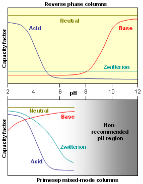 Retention profiles of the different ionizable and neutral compounds at different pH (using only reverse phase mechanism) show no common pH where all the different molecules can be retained. Because of that, it is always difficult to analyze samples containing acidic, basic, and zwitterionic compounds in a single HPLC analysis.