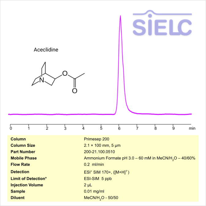 Aceclidine can be retained and analyzed using the Primesep 200 stationary phase column. The analysis utilizes an isocratic method with a simple mobile phase consisting of water and acetonitrile (MeCN) with a Ammonium format as a buffer. Detection is performed using ESI+ SIM.