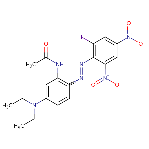 Acetamide, N-[5-(diethylamino)-2-[(2-iodo-4,6-dinitrophenyl)azo]phenyl]- can be analyzed by this reverse phase (RP) HPLC method with simple conditions. The mobile phase contains an acetonitrile (MeCN), water, and phosphoric acid. For Mass-Spec (MS) compatible applications the phosphoric acid needs to be replaced with formic acid. Smaller 3 µm particles columns available for fast UPLC applications. This liquid chromatography method is scalable and can be used for isolation impurities in preparative separation. It also suitable for pharmacokinetics.