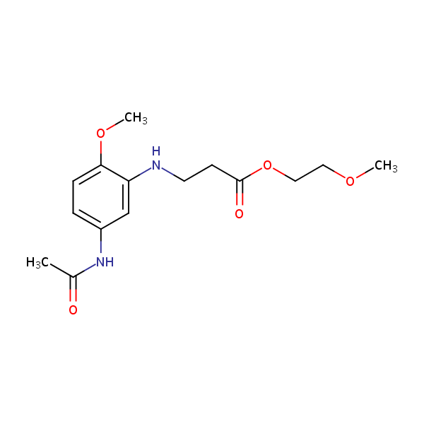.beta.-Alanine, N-[5-(acetylamino)-2-methoxyphenyl]-, 2-methoxyethyl ester can be analyzed by this reverse phase (RP) HPLC method with simple conditions. The mobile phase contains an acetonitrile (MeCN), water, and phosphoric acid. For Mass-Spec (MS) compatible applications the phosphoric acid needs to be replaced with formic acid. Smaller 3 µm particles columns available for fast UPLC applications. This liquid chromatography method is scalable and can be used for isolation impurities in preparative separation. It also suitable for pharmacokinetics.