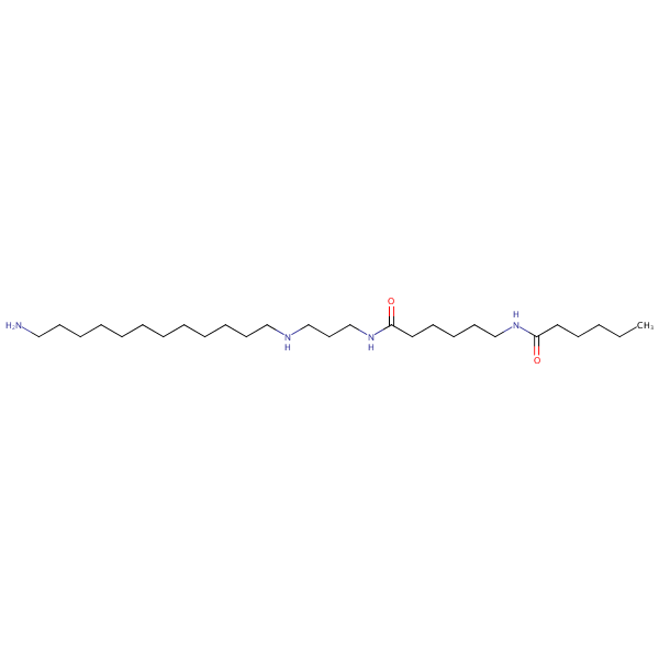 Hexanamide, N-[3-[(12-aminododecyl)amino]propyl]-6-[(1-oxohexyl)amino]- can be analyzed by this reverse phase (RP) HPLC method with simple conditions. The mobile phase contains an acetonitrile (MeCN), water, and phosphoric acid. For Mass-Spec (MS) compatible applications the phosphoric acid needs to be replaced with formic acid. Smaller 3 µm particles columns available for fast UPLC applications. This liquid chromatography method is scalable and can be used for isolation impurities in preparative separation. It also suitable for pharmacokinetics.