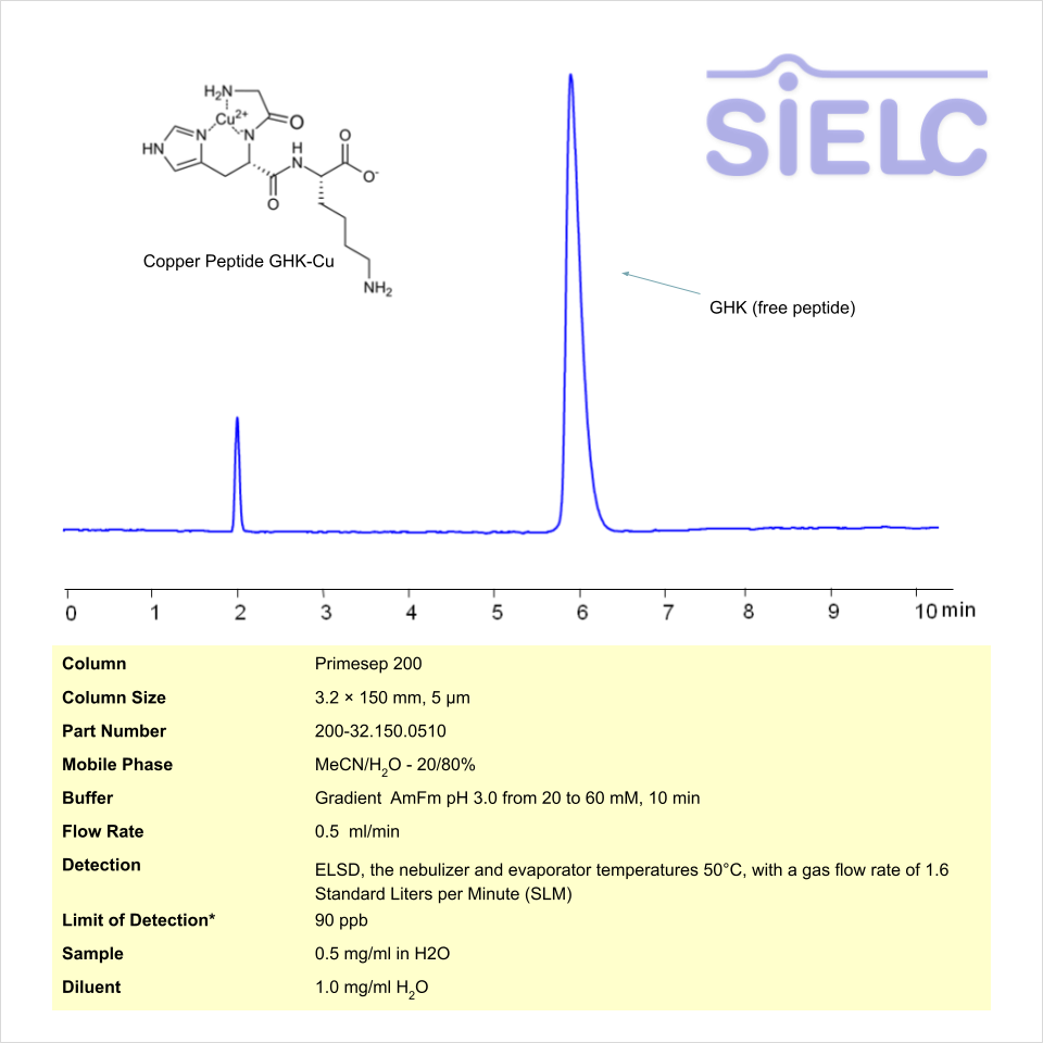 Copper peptide (GHK-Cu) can be retained and analyzed using the Primesep 200 stationary phase column. The analysis utilizes a gradient method with a simple mobile phase consisting of water and acetonitrile (MeCN) with a ammonium formate buffer. Detection is performed using ELSD.