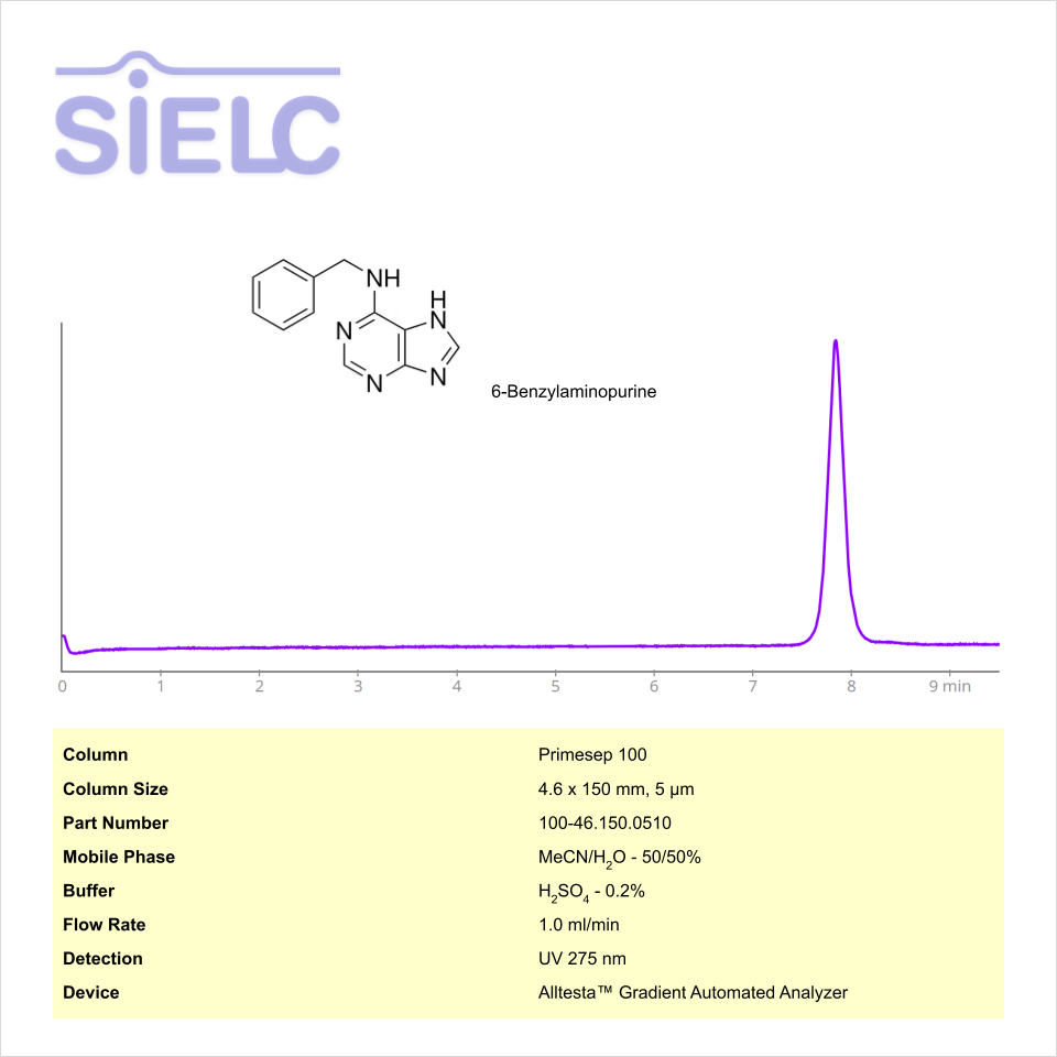 6-Benzylaminopurine can be retained and analyzed using the Primesep 100 stationary phase column. The analysis utilizes an isocratic method with a simple mobile phase consisting of water and acetonitrile (MeCN) with a sulfuric acid buffer. Detection is performed using UV.