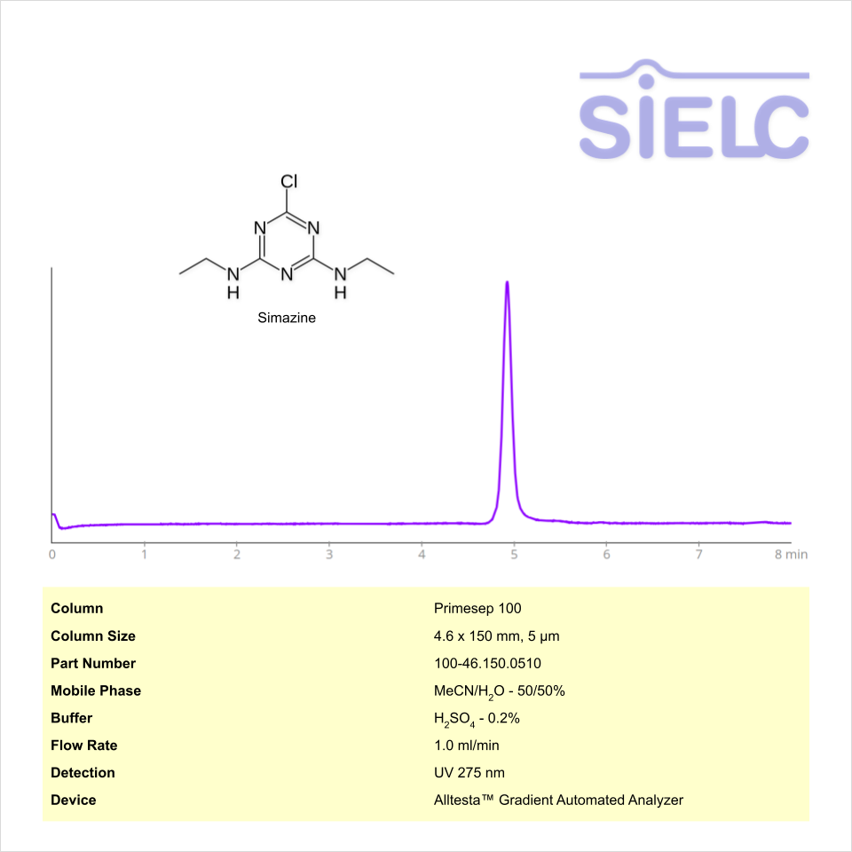 Simazine can be retained and analyzed using the Primesep 100 stationary phase column. The analysis utilizes an isocratic method with a simple mobile phase consisting of water and acetonitrile (MeCN) with a sulfuric acid buffer. Detection is performed using UV.