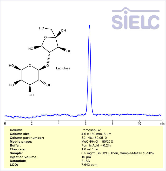 Lactulose can be retained and analyzed using the Primesep S2 stationary phase column. The analysis utilizes an isocratic method with a simple mobile phase consisting of water, acetonitrile (MeCN), and formic acid. Detection is performed using ELSD.