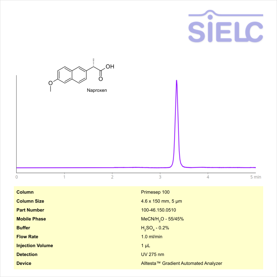 Naproxen can be retained and analyzed using the Primesep 100 stationary phase column. The analysis utilizes an isocratic method with a simple mobile phase consisting of water and acetonitrile (MeCN) with phosphoric acid as a buffer. Detection is performed using UV.
