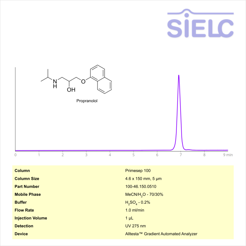 Propranolol can be retained and analyzed using the Primesep 100 stationary phase column. The analysis utilizes an isocratic method with a simple mobile phase consisting of water and acetonitrile (MeCN) with phosphoric acid as a buffer. Detection is performed using UV.