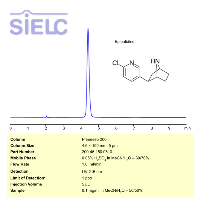 Epibatidine can be retained and analyzed using the Primesep 200 stationary phase column. The analysis utilizes an isocratic method with a simple mobile phase consisting of water and acetonitrile (MeCN) with a sulfuric acid buffer. Detection is performed using UV.
