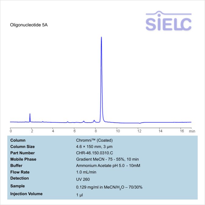 Oligonucleotides can be retained and analyzed using the Chromni stationary phase column. The analysis utilizes an gradient method with a simple mobile phase consisting of water and acetonitrile (MeCN) with a ammonium acetate as a buffer. Detection is performed using UV.
