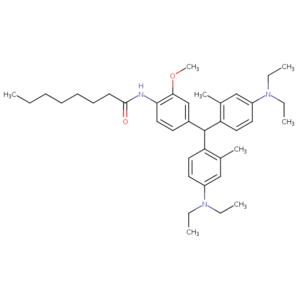 Octanamide, N-[4-[bis[4-(diethylamino)-2-methylphenyl]methyl]-2-methoxyphenyl]- can be analyzed by this reverse phase (RP) HPLC method with simple conditions. The mobile phase contains an acetonitrile (MeCN), water, and phosphoric acid. For Mass-Spec (MS) compatible applications the phosphoric acid needs to be replaced with formic acid. Smaller 3 µm particles columns available for fast UPLC applications. This liquid chromatography method is scalable and can be used for isolation impurities in preparative separation. It also suitable for pharmacokinetics.