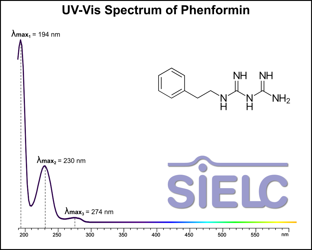 Phenformin can be analyzed by this reverse phase (RP) HPLC method with simple conditions. The mobile phase contains an acetonitrile (MeCN), water, and phosphoric acid. For Mass-Spec (MS) compatible applications the phosphoric acid needs to be replaced with formic acid. Smaller 3 µm particles columns available for fast UPLC applications. This liquid chromatography method is scalable and can be used for isolation impurities in preparative separation. It also suitable for pharmacokinetics.