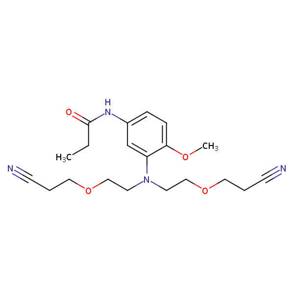 Propanamide, N-[3-[bis[2-(2-cyanoethoxy)ethyl]amino]-4-methoxyphenyl]- can be analyzed by this reverse phase (RP) HPLC method with simple conditions. The mobile phase contains an acetonitrile (MeCN), water, and phosphoric acid. For Mass-Spec (MS) compatible applications the phosphoric acid needs to be replaced with formic acid. Smaller 3 µm particles columns available for fast UPLC applications. This liquid chromatography method is scalable and can be used for isolation impurities in preparative separation. It also suitable for pharmacokinetics.