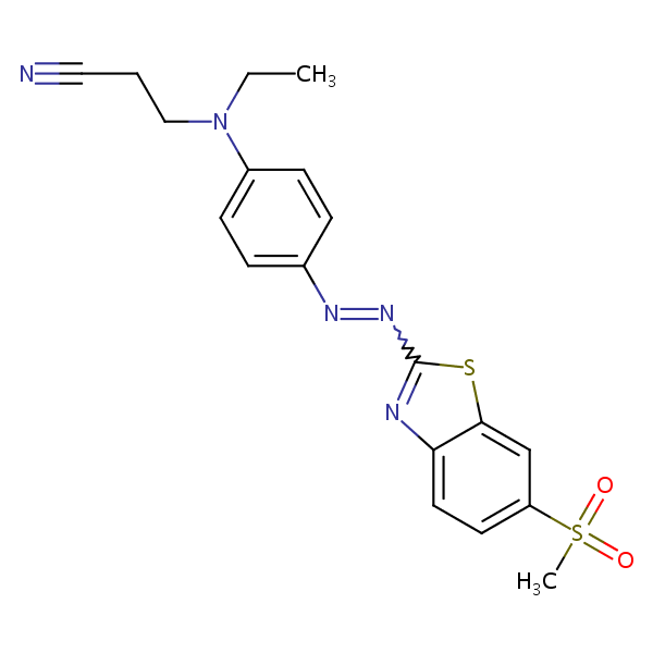 Propanenitrile, 3-[ethyl[4-[[6-(methylsulfonyl)-2-benzothiazolyl]azo]phenyl]amino]- can be analyzed by this reverse phase (RP) HPLC method with simple conditions. The mobile phase contains an acetonitrile (MeCN), water, and phosphoric acid. For Mass-Spec (MS) compatible applications the phosphoric acid needs to be replaced with formic acid. Smaller 3 µm particles columns available for fast UPLC applications. This liquid chromatography method is scalable and can be used for isolation impurities in preparative separation. It also suitable for pharmacokinetics.