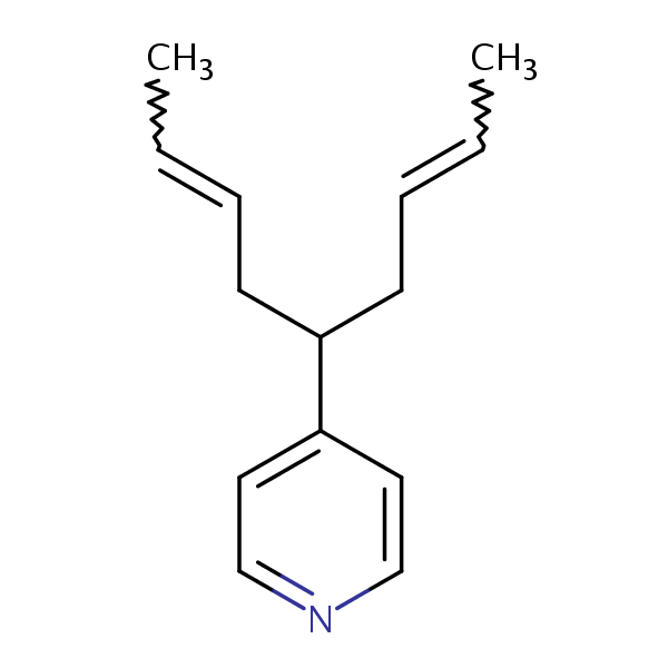 Pyridine, 4-[1-(2-butenyl)-3-pentenyl]- can be analyzed by this reverse phase (RP) HPLC method with simple conditions. The mobile phase contains an acetonitrile (MeCN), water, and phosphoric acid. For Mass-Spec (MS) compatible applications the phosphoric acid needs to be replaced with formic acid. Smaller 3 µm particles columns available for fast UPLC applications. This liquid chromatography method is scalable and can be used for isolation impurities in preparative separation. It also suitable for pharmacokinetics.